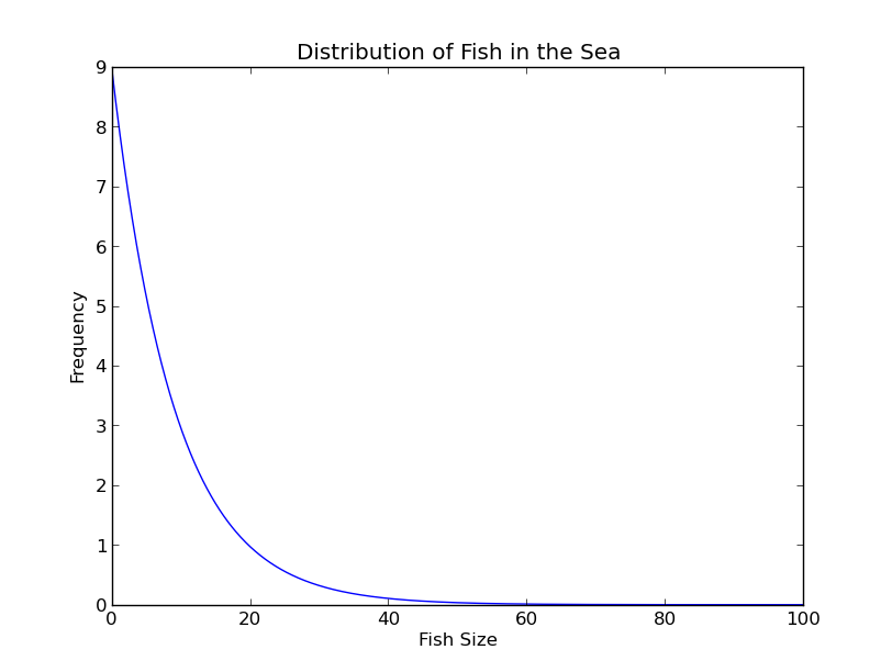 Smaller fish are much more common than larger fish. This is reflected in the distribution of fish. It looks like this (definitely not a bell curve!):