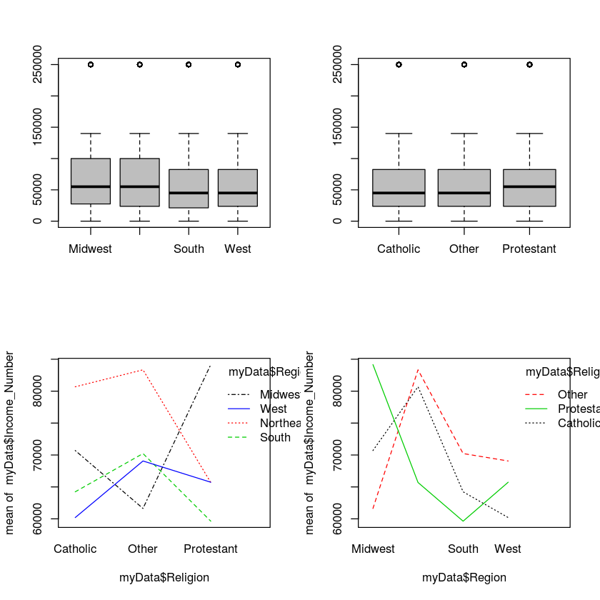 From this interaction plot, it looks like there is an interaction between region and religion. For example, Catholics make more money than Protestants in the Northeast, but they make less money in the South and West.